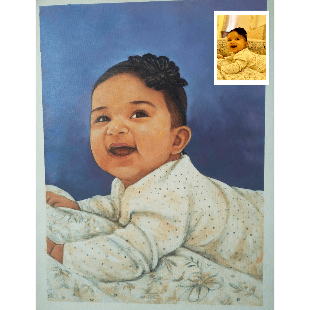 Authentic 100% Handmade Baby Oil Painting from Photo made by the professional portrait artists. Each piece is unique with even the utmost attention to minute details. A boon to the artistic world and definitely the best gift for the New parents to adorn their house walls with a human-made real-life painting embracing their love.